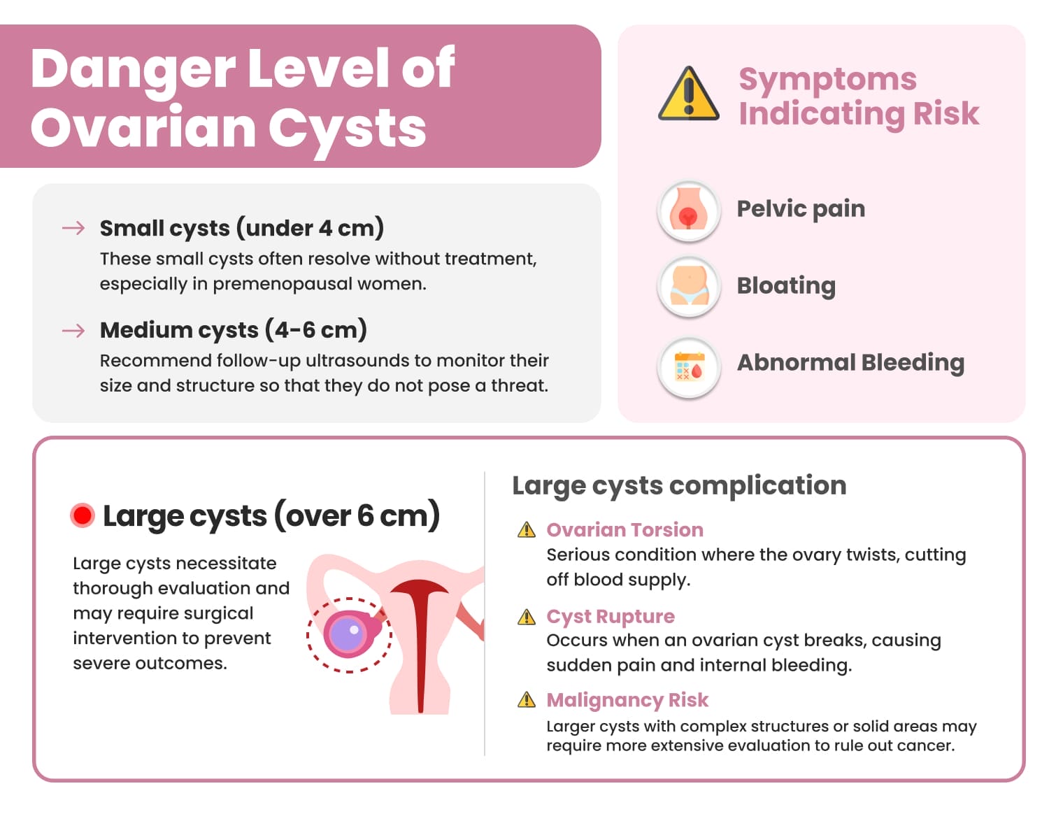 Cysts larger than 6 cm raise more concern. They have a higher likelihood of causing symptoms and complications such as ovarian torsion or rupture. Large cysts necessitate thorough evaluation and may require surgical intervention to prevent severe outcomes.
